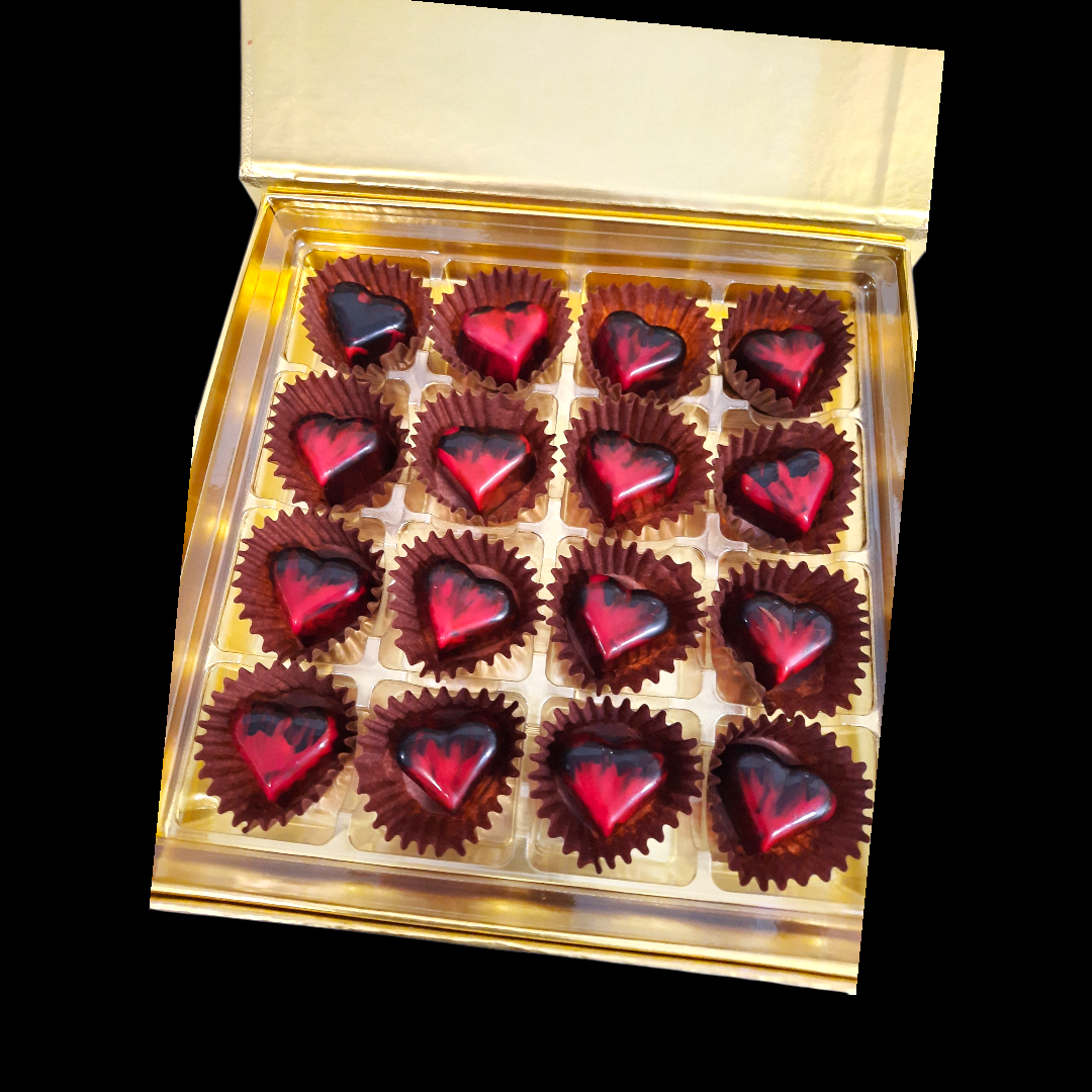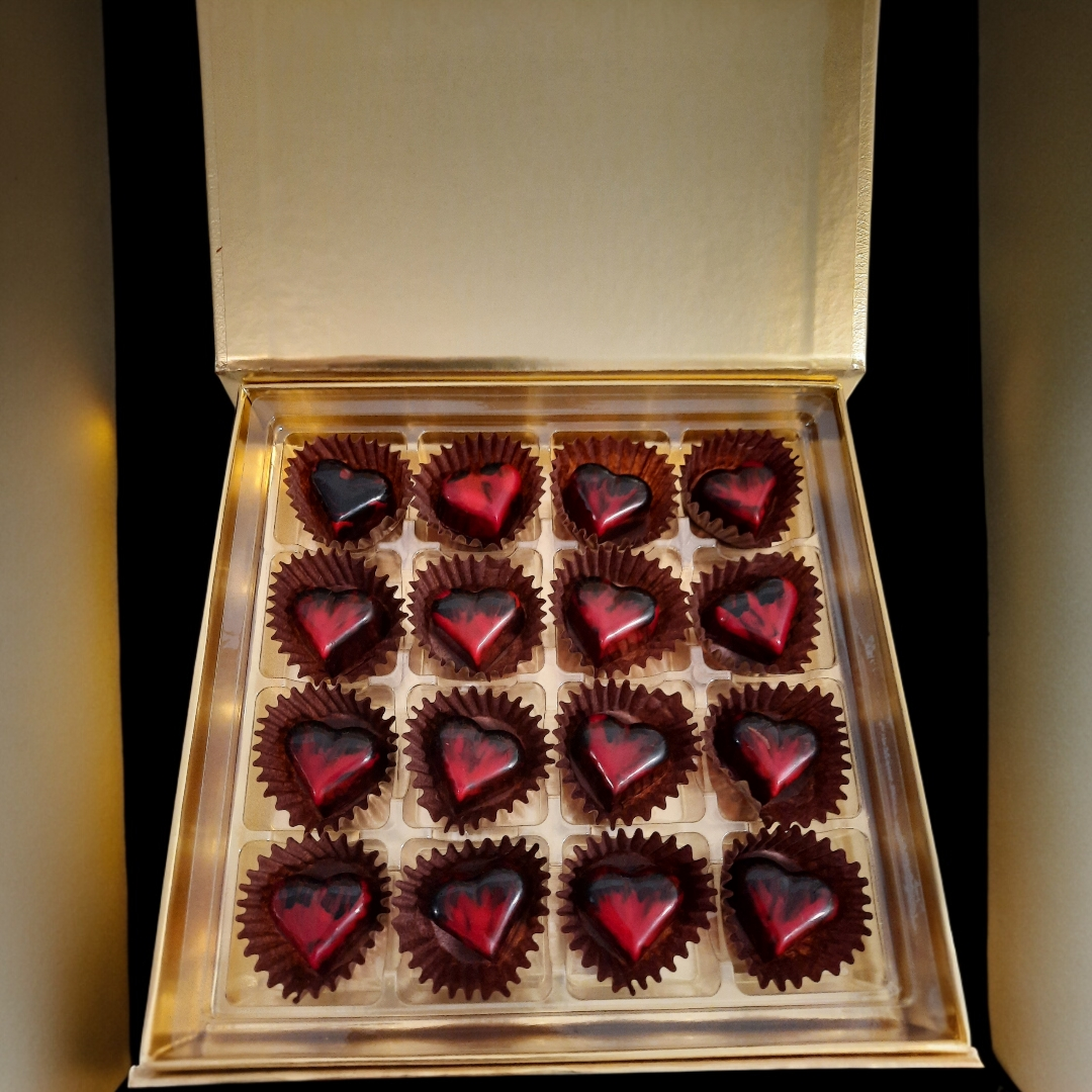 We start by painting the molds with organic cocoa butter that we color in- house without harmful dyes then added the most delicious organic dark chocolate. These hearts will still yours!